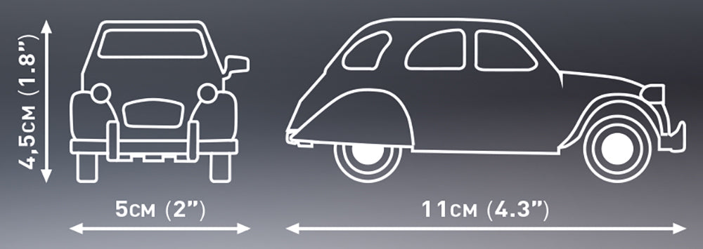 Aus 85 COBI-Bausteinen bauen Sie ein Modell des kultigen Citroen 2CV Charleston, perfekt nachgebildet im Maßstab 1:35. Dank der Verwendung von speziell für dieses Auto entwickelten Elementen ist die Form der Karosserie so nah wie möglich am Original. Bemerkenswert sind auch die komplett neuen Scheinwerfer, die sicherlich in vielen Modellen der COBI Historical Collection zum Einsatz kommen werden! Das Auto ist mit 4 beweglichen Rädern und Aufdrucken der wichtigsten Details ausgestattet. Der Citroen ist 11 cm lang und 4,5 cm hoch. Der Bausatz enthält ein Schild mit der Signatur des Modells und dem CITROEN-Logo aus der Zeit! Die aufgedruckten Nummernschilder zeigen auch die Modellbezeichnung.